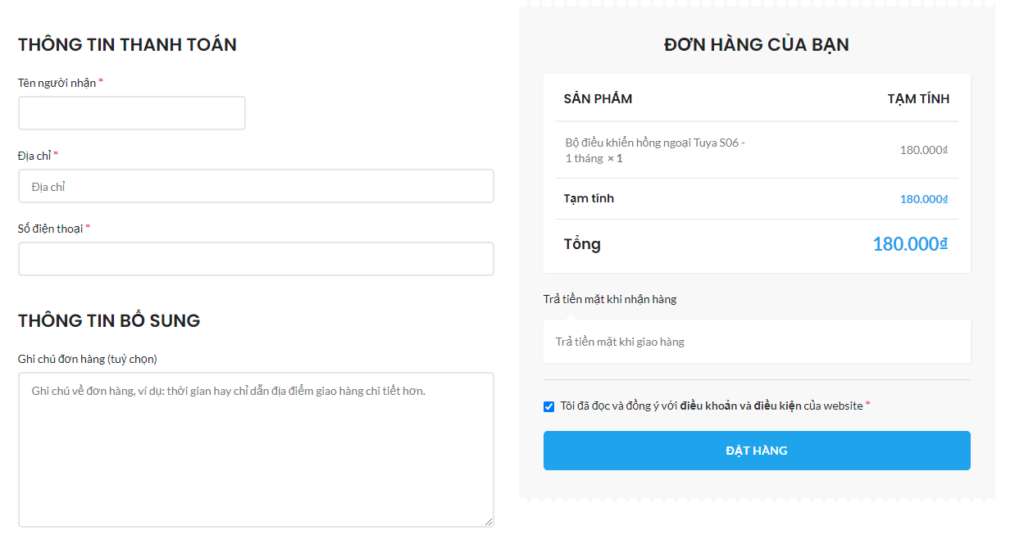 – Bấm vào ” Tôi đã đọc và đồng ý với điều khoản và điều kiện của website ” và cuối cùng bấm vào “Đặt hàng” để kết thúc quá trình đặt hàng.